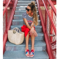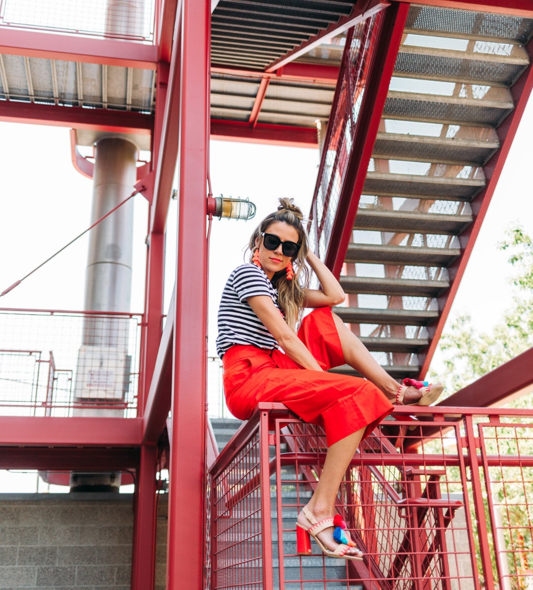 It’s a common joke in the house that when I get passionate about things I get really animated, move my hands around a lot, or raise my voice (when I’m not even mad). Or when we argue (yes we argue haha and it’s usually over really dumb things), Cody always teases me that I can get feisty and attributes it to my ‘spicy latin blood’ (I’m half Colombian – so when I saw this shirt I had to get it and it looks even better in person. I love the intersection of a graphic tee with embellishment – how good are these tassels! I definitely haven’t been shying away from bright colors lately. I love these bold red Kate Spade pants and they are actually really versatile! I’ve already worn them multiple times. And the statement bow totally makes them unique and a statement piece. And of course the shoes! I never shy away from pom poms!! Obsessed with these sandals!